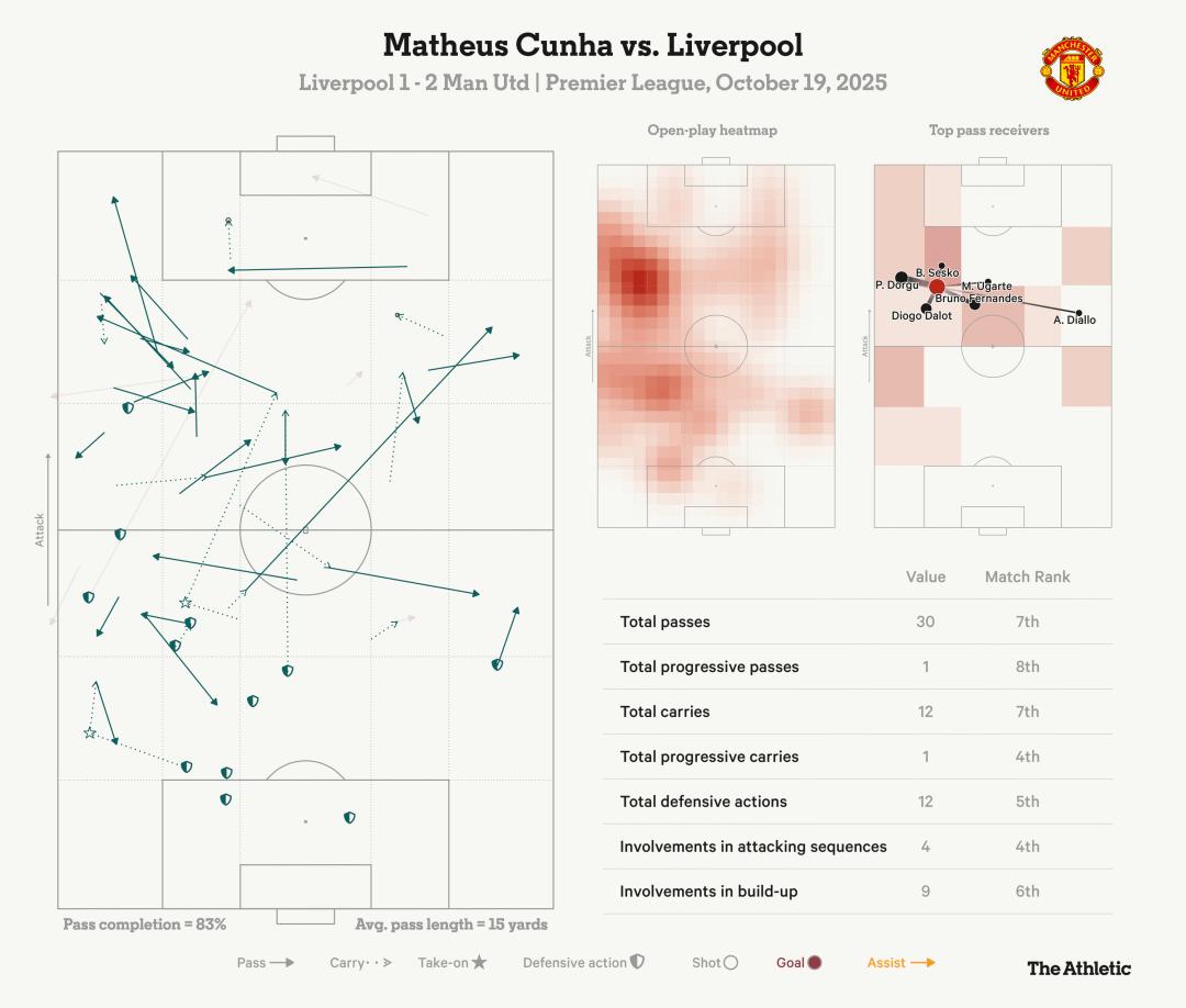 馬特烏斯·庫尼亞作為夏季轉會窗首位以6250萬英鎊加盟曼聯的球員,若球迷期待他延續在狼隊時15球6助攻的表現,顯然目前尚未達成。8輪戰罷,這位26歲的巴西前鋒仍未取得進球或助攻,有時甚至在與梅森·芒特的競爭中失去首發位置。然而,這位昔日「狼王」仍擁有其價值,在與利物浦的雙紅會中,庫尼亞雖無傳射數據,但仍發揮了關鍵作用,特別是在比賽末段維持比分時。