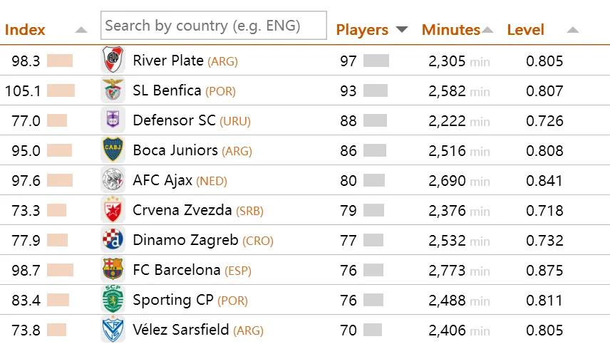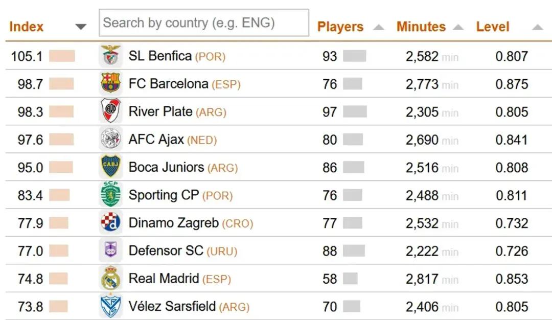 從青訓球員進入49個聯賽一線隊的人數來看,河床以97人居首,本菲卡(93人)排名第二,烏拉圭小俱樂部庇護者體育(88人)意外躍居第三,巴薩則僅並列第八;而在青訓球員一線隊出場時間方面,巴斯克雙雄皇家社會(3394分鐘)和畢爾包競技(3215分鐘)占據前兩位,比甲亨克(3086分鐘)排名第三。