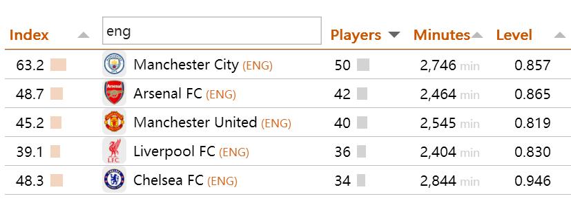 英超共有5家俱樂部入圍,傳統六強中僅熱刺落選。英超內部,曼城青訓表現突出:青訓球員進入一線隊人數最多(50人)、出場時間最長(2746分鐘),總分(63.2分)也遠超排名第二的阿森納(48.7分)。
