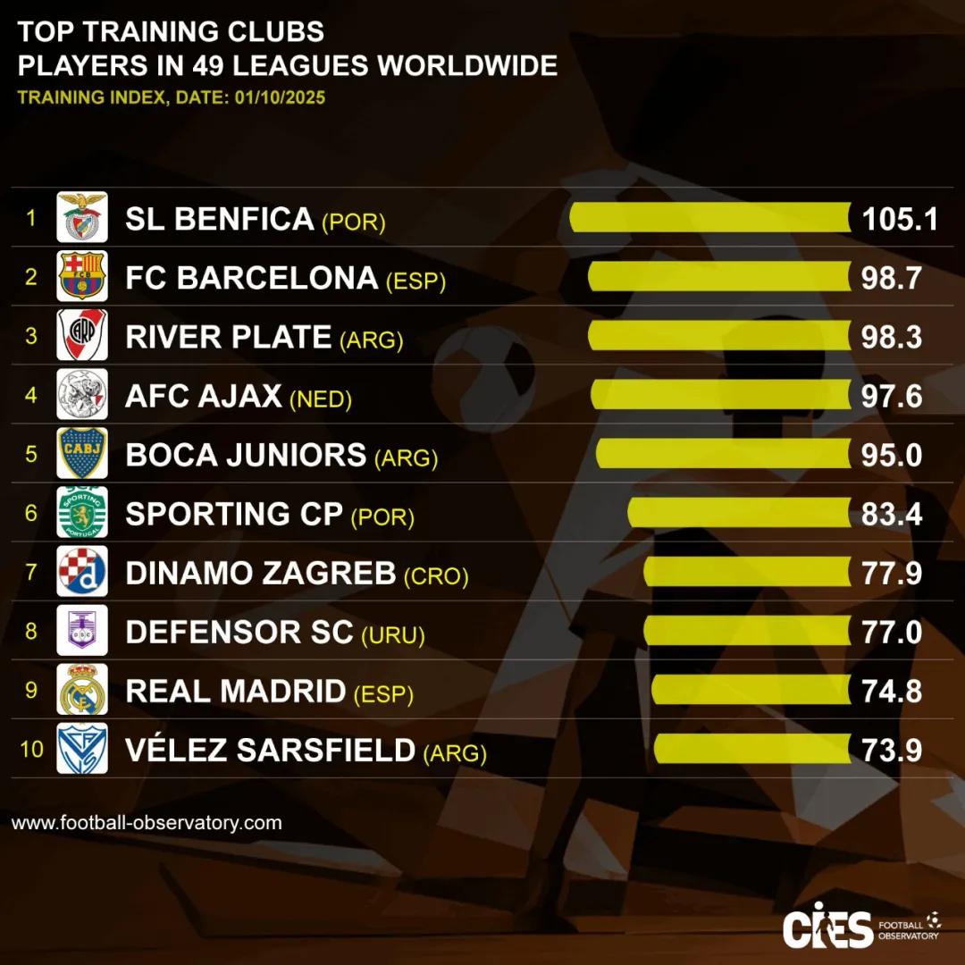 得分超過90分的俱樂部還有河床(98.3分)、阿積士(97.6分)和博卡青年(95.0分)。值得注意的是,排名前五的青訓俱樂部與去年完全一致,且這五家俱樂部的得分呈現「斷崖式」領先,基本符合外界對世界頂級青訓俱樂部水準的認知。
