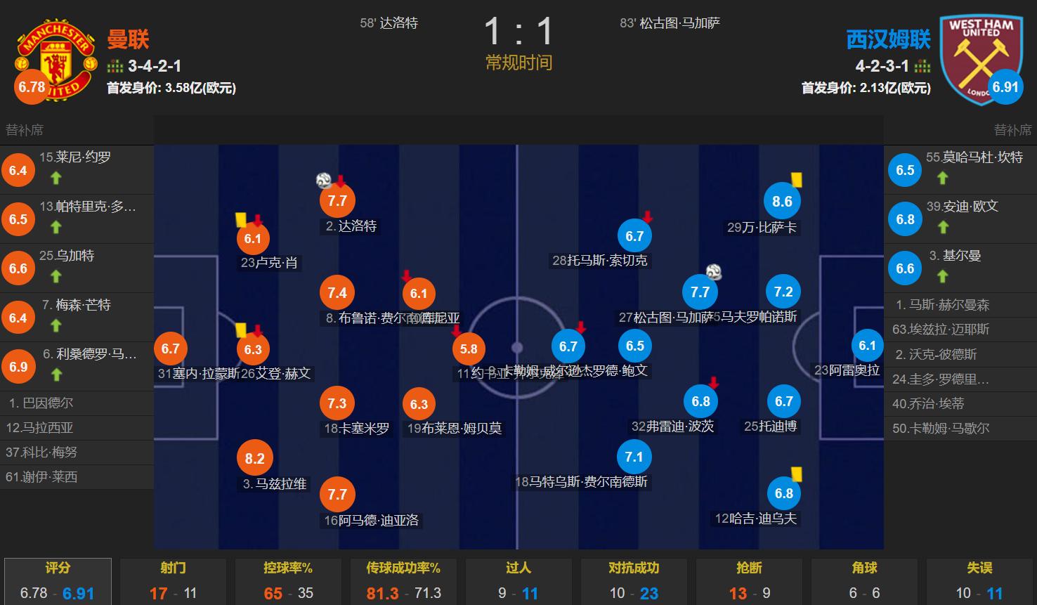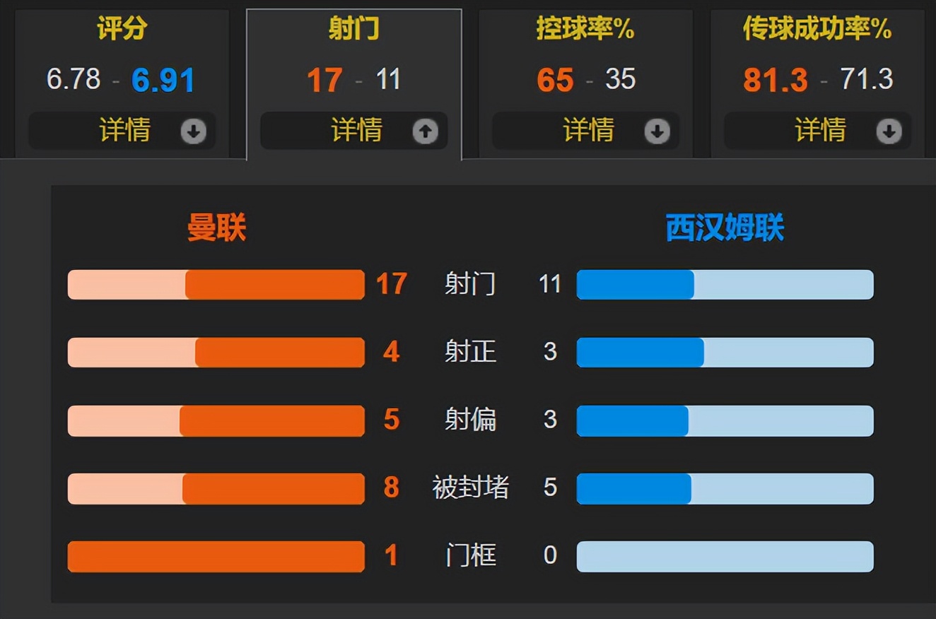 全場比賽,曼聯控球率達65%,共射門17次,其中4次射正;西漢姆聯射門11次,射正3次。其中B費射門6次僅1次射正,未能破門,射門技術確實稍顯不足,但他本場送出5次關鍵傳球。
