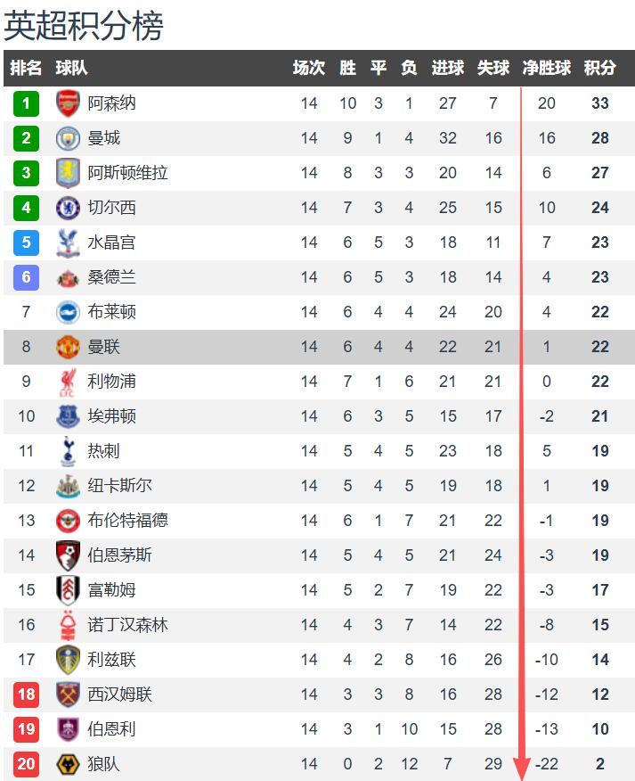 曼聯本季沒有歐戰任務,英超成績也不理想,但幸運的是本季表現不佳的球隊太多,導致曼聯雖然14輪取得6勝4平4負,累積22分排名第八,卻僅落後第五名水晶宮1分。以目前的歐戰積分來看,前五名均可獲得歐冠資格,因此曼聯本季爭奪歐冠席位仍有很大機會,但他們必須提升對陣中下游球隊時的表現。