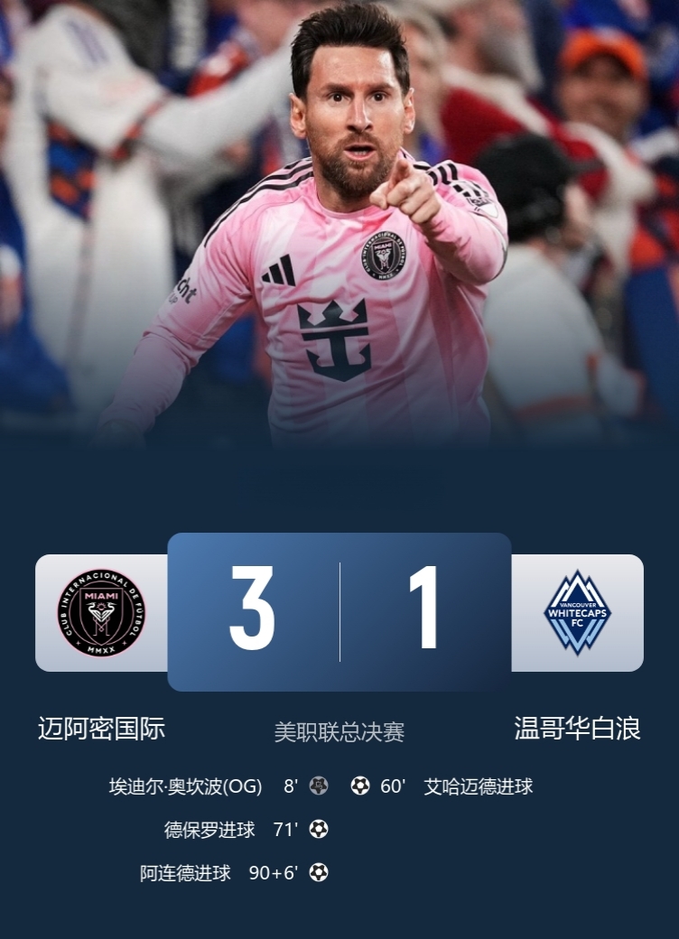 最終,邁阿密國際以3-1擊敗溫哥華白浪,隊史首次摘得美職聯總冠軍,梅西收穫個人第47座冠軍獎盃。