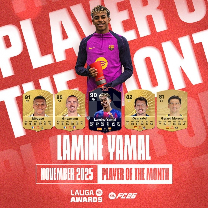 亞馬爾近期狀態極為出色。這位18歲天才在對陣埃爾切、塞爾塔維戈及阿拉維斯的比賽中都有進球,並在對陣畢爾包的勝利中貢獻兩次助攻。整個11月,他共攻入3球並送出3次助攻,領先西甲助攻榜(共8次)。憑藉這些表現,亞馬爾擊敗了姆巴佩和格列茲曼等強敵, 榮獲當月最佳球員獎項。