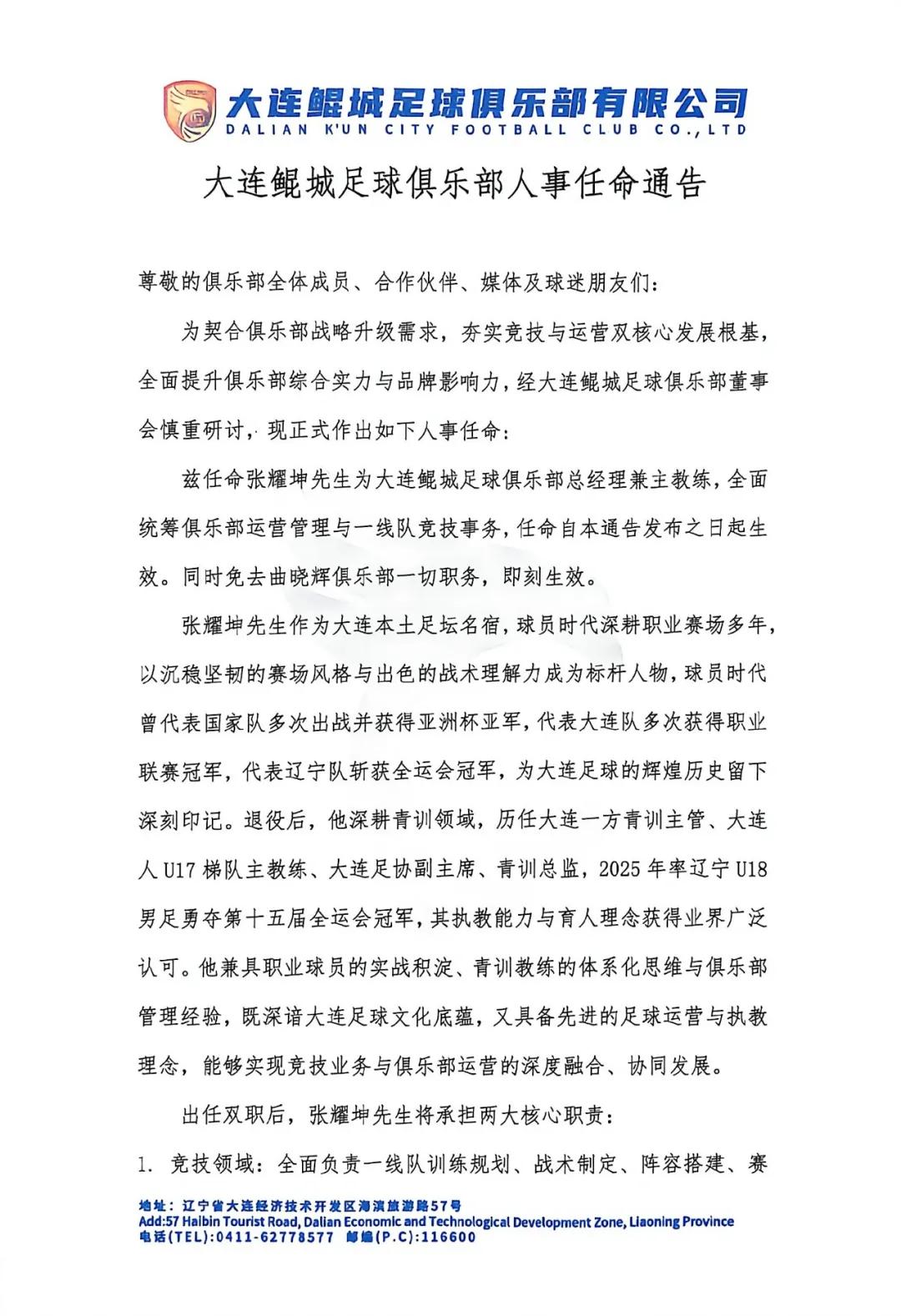 今晨,大連鯤城官方發布公告:“特此任命張耀坤先生為大連鯤城足球俱樂部總經理兼主教練,全面負責俱樂部運營管理及一線隊競技事務,任命自本公告發布日起生效。同時免去曲曉輝(原總經理)俱樂部所有職務,即時生效。”