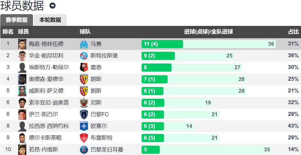 自上賽季以來,格林伍德在法甲共參與40個進球(進球+助攻),此數據在五大聯賽中排名第六,僅次於直接參與56球的凱恩、54球的薩拉赫與姆巴佩、45球的哈蘭德以及41球的奧利塞。