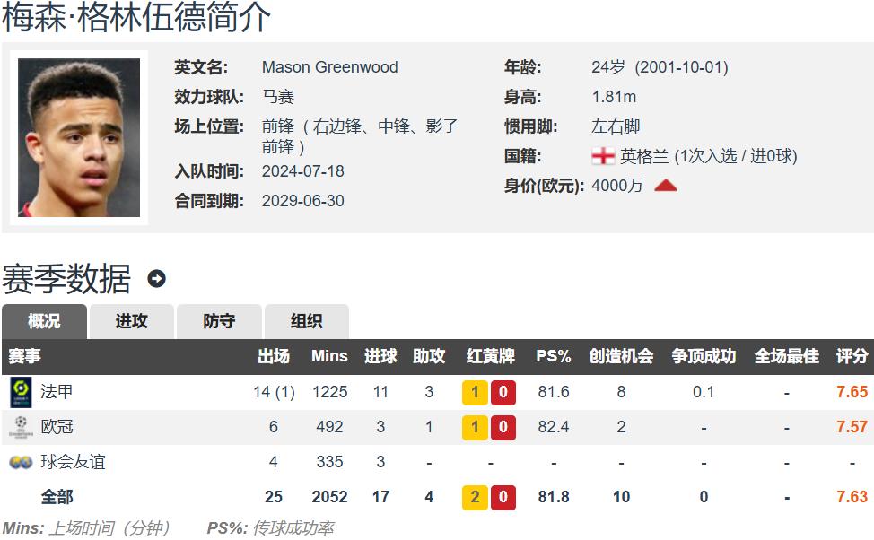 格林伍德是曼聯棄將,現年24歲,正值球員黃金期,罕見的左右腳兼備球員,主打右邊鋒,也能擔任中鋒及二前鋒,德轉估價4000萬歐元。格林伍德上賽季法甲34場攻入21球助攻5次,本賽季延續佳績,15場法甲11球3助。