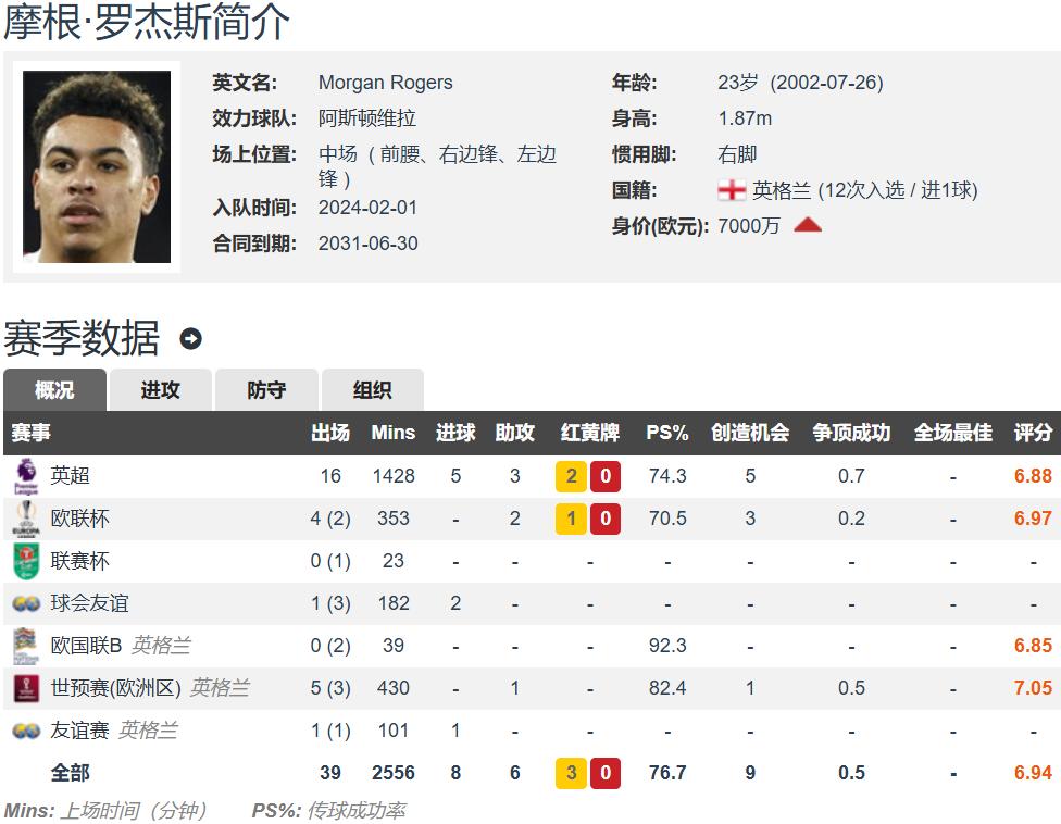 羅傑斯現年23歲,身高1.87米,慣用右腳,主打前腰位置,與阿斯頓維拉的合約到2031年。德國轉會市場估價7000萬歐元,已代表英格蘭國家隊出場12次,有望成為2026年世界杯英格蘭隊的重要競爭者,在圖赫爾的戰術體系中地位甚至超越貝林厄姆。羅傑斯本輪英超上演梅開二度,助阿斯頓維拉3-2客場逆轉西漢姆聯,取得近11輪英超的第10場勝利。本賽季各項賽事23場貢獻5球5助攻,是阿斯頓維拉英超第三名及英超與歐聯杯雙線爭冠的絕對主力。