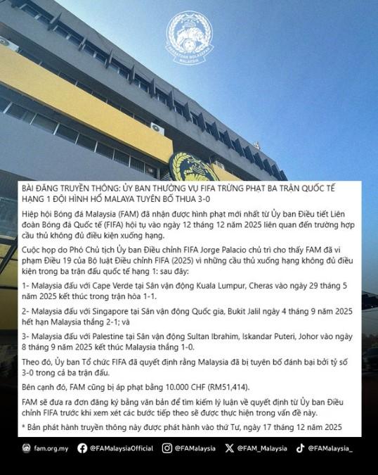 2025年12月17日,國際足球聯合會紀律委員會正式就馬來西亞足球協會涉嫌使用不合格球員事件作出裁決。根據決定, FIFA認定馬來西亞足球協會違反2025年版FIFA紀律條例第19條,並宣告馬來西亞隊三場比賽均以0-3判負 ,同時處以1萬瑞士法郎罰款。