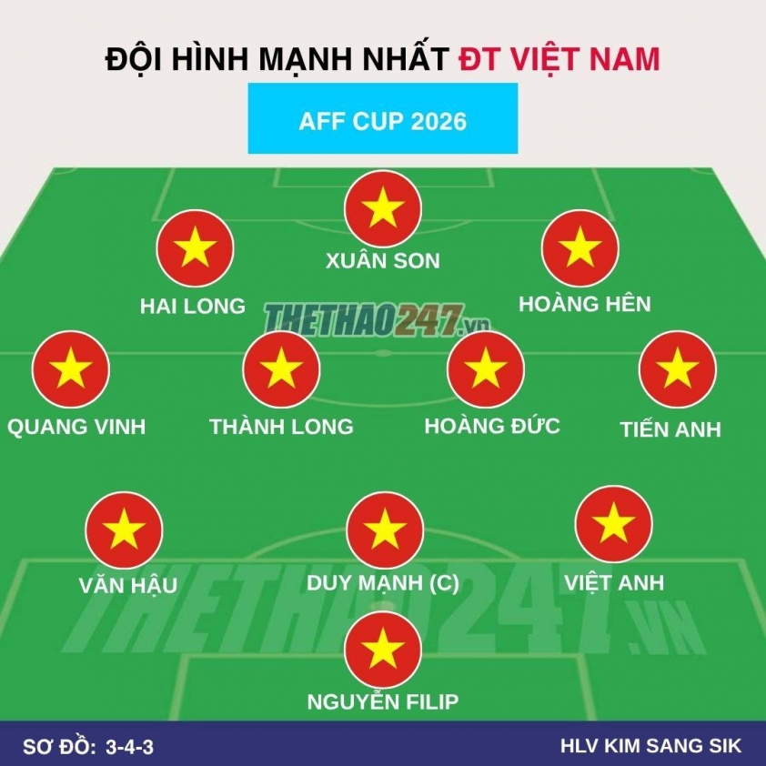 Based on the current squad, the Vietnam team can operate flexibly with two different tactical setups, depending on the opponent and squad situation. In the first option, considered the most optimal lineup, the goalkeeper position belongs to Nguyen Filip. The three central defenders consist of Doan Van Hau on the left, Do Duy Manh in the center, and Bui Hoang Viet Anh on the right.