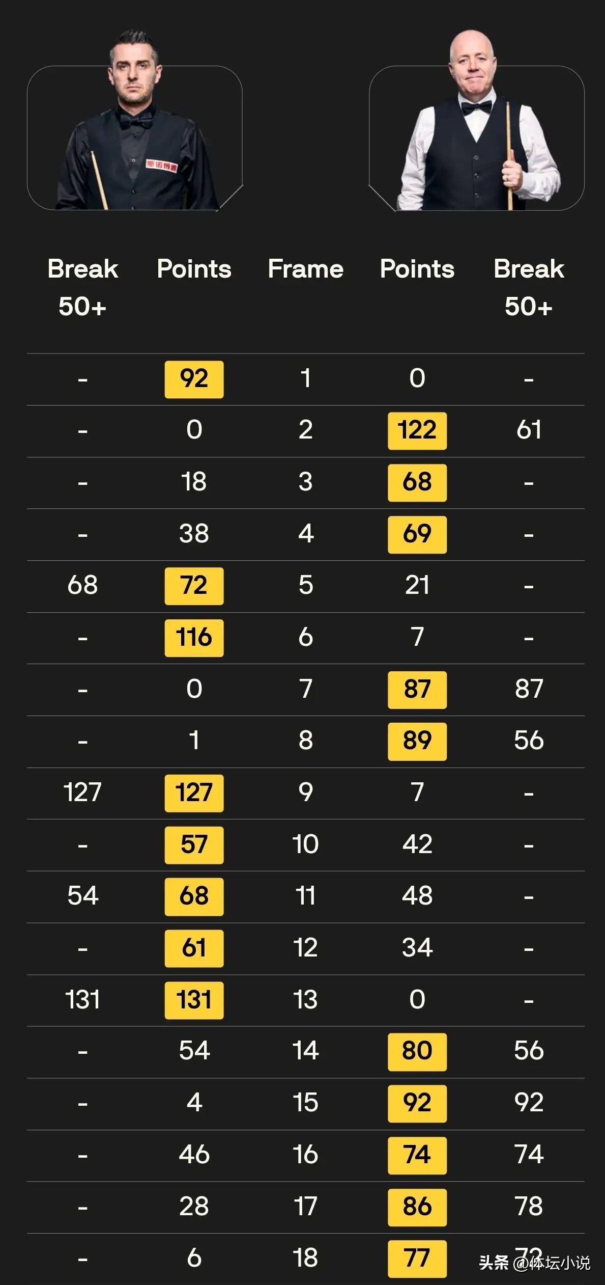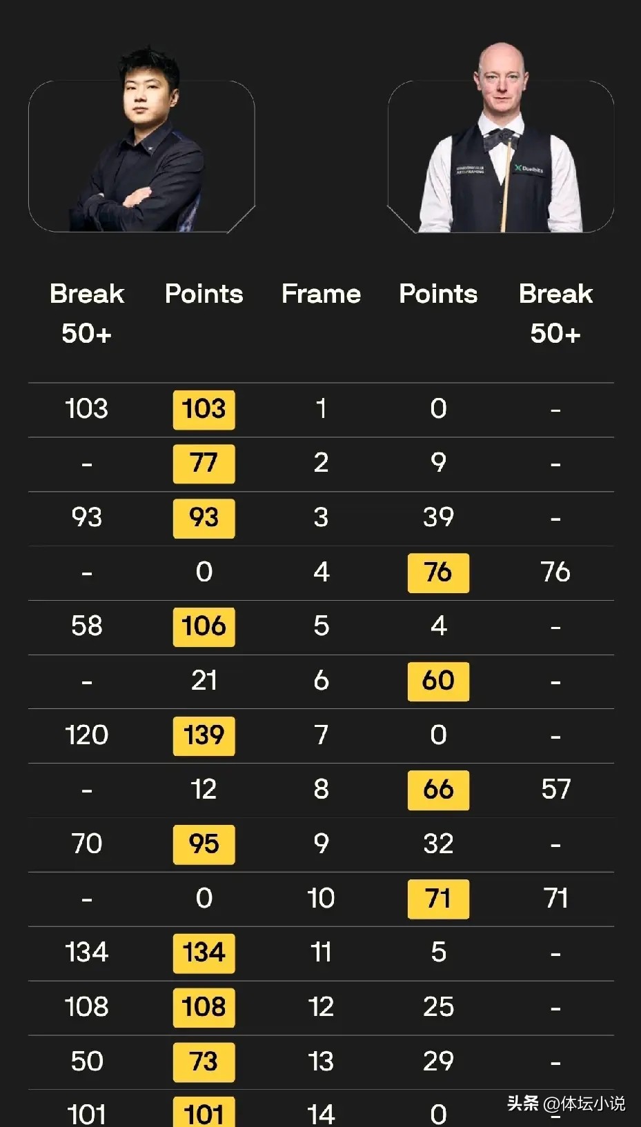 Higgins versus Selby. A clash between the "75s Three Legends" and the "80s Five Tigers" promised a tough battle. After the match began, Higgins produced three 50+ breaks to establish a slight 5-3 lead. In the second stage, Selby mounted a major counterattack with two century breaks and one 50+ break, winning five straight frames to reverse the deficit and lead 8-5. However, Higgins responded forcefully, firing five 50+ breaks with powerful accuracy to overwhelm Selby, answering with a 5-0 surge to eliminate Selby 10-8 and advance to the semifinals!