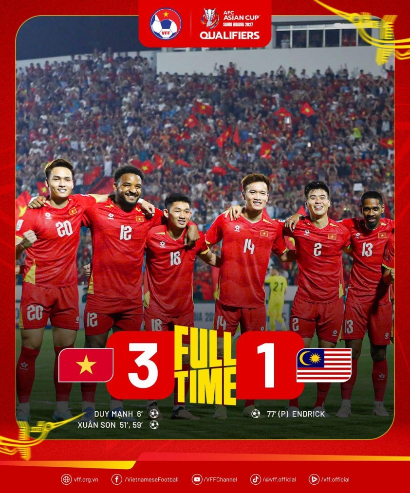 Concluding the match, outlet 163 particularly emphasized: “Vietnam defeated Malaysia at home, achieving six consecutive wins in Asian Cup qualifiers, a perfect six-match record with 18 absolute points, and proudly advancing to the finals. Truly impressive!” This detail was regarded by Chinese media as the campaign's highlight, as Vietnam not only progressed but also demonstrated superior form with a flawless record—something not easily achieved at continental level.