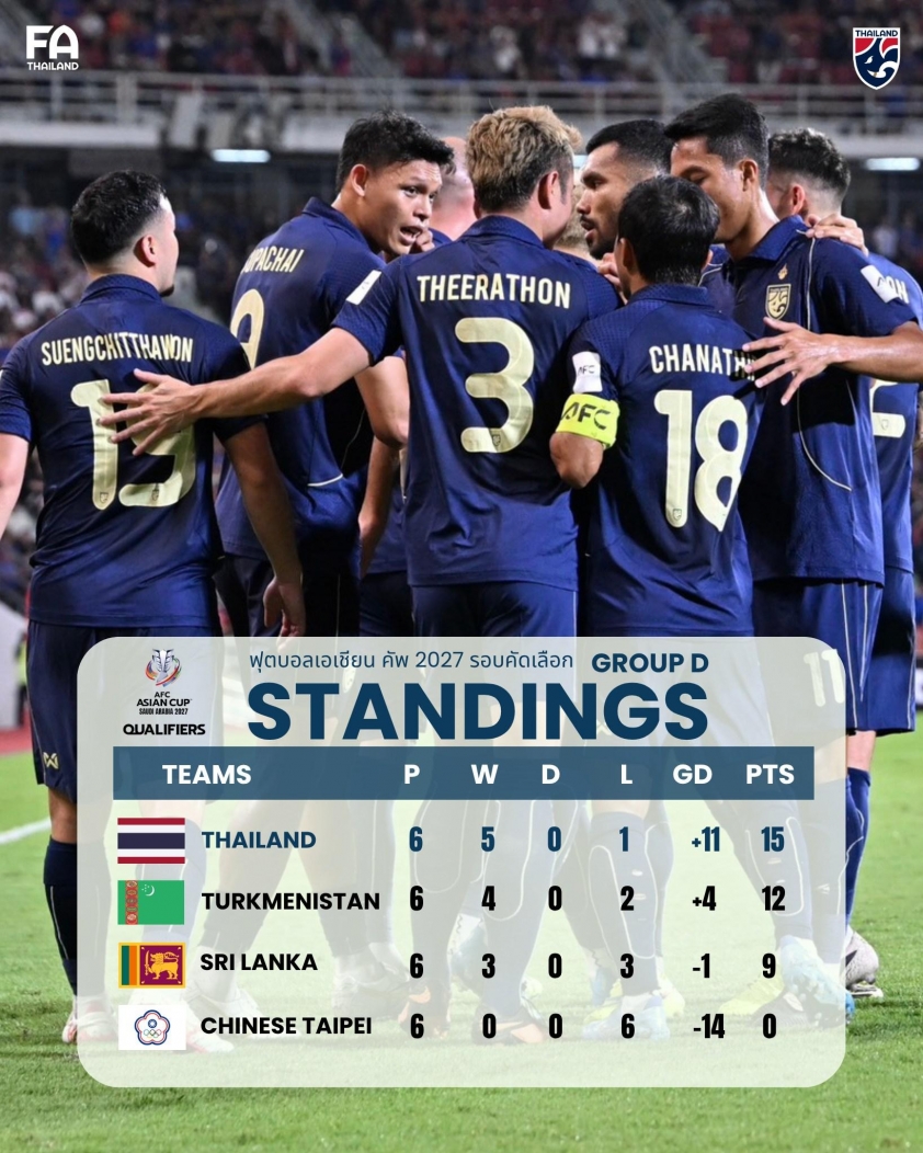 Speaking after the 2-1 victory over Turkmenistan in the final match of Group D qualifying, Theerathon expressed happiness about securing a spot for the 2027 Asian Cup with the national team. He emphasized that this win was very meaningful for the fans and admitted that if the result had been a draw, the atmosphere would definitely not have been as electrifying.