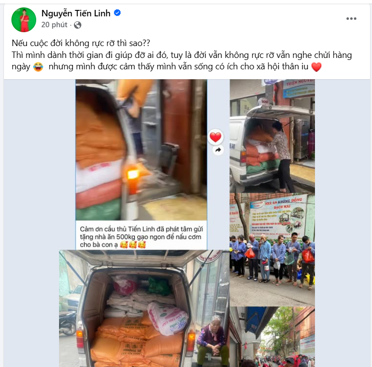 On the evening of April 4th, forward Nguyễn Tiến Linh once again caught fans' attention by sharing images of charitable activities on his personal Facebook page. On his personal page, Tiến Linh wrote: "If life isn't dazzling, what then? Then I spend time helping someone. Even though life remains unglamorous and I hear criticism daily, I feel I'm still living a life beneficial to society, dear.".