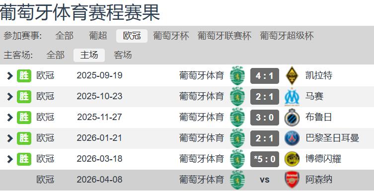 Sporting CP's home ground is not an easy place to play! This season in the Champions League, Sporting CP have achieved five consecutive victories at home, specifically:in the league phase, a 4-1 win over newcomers Almaty, a 2-1 victory over Marseille, a 3-0 win against Club Brugge, a 2-1 defeat of reigning champions Paris Saint-Germain, and in the round of 16, a 5-0 win over Bodø/Glimt (including extra time).Sporting CP will host Arsenal in the first leg of the Champions League quarter-finals. This match is highly anticipated by fans, as Arsenal have recently suffered two consecutive defeats: losing the League Cup final 0-2 to Manchester City and being eliminated from the FA Cup quarter-finals with a 1-2 loss to Championship side Southampton, cutting their pursuit of four trophies down to two.