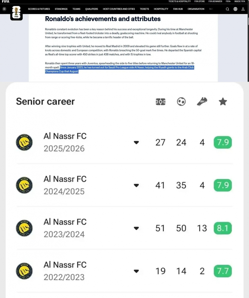 The controversial goals were scored by Ronaldo in the Arab Club Champions Cup 2023 – a tournament that caused confusion about its official status. Some opinions argued it was merely a friendly competition, so it shouldn't be counted in personal statistics.