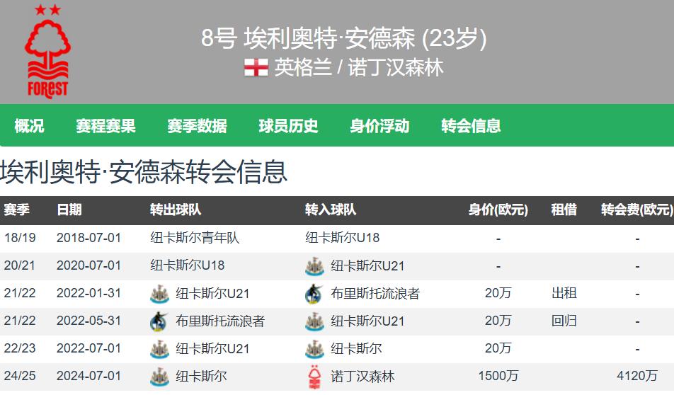 Anderson came from Newcastle's youth academy. In the summer transfer window of 2024, he moved from Newcastle to Nottingham Forest for a transfer fee of €41.2 million, embarking on his path as a Premier League homegrown star. His outstanding performances in the Premier League have attracted attention from several Big Six clubs.