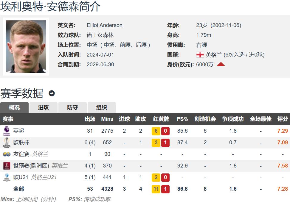 Anderson is currently 23 years old, stands 1.79 meters tall, is a right-footed player, and can play as a midfielder, attacking midfielder, or defensive midfielder. His contract with Nottingham Forest runs until 2029. His Transfermarkt valuation is €60 million. So far this season, he has played 41 matches across all competitions, scoring 2 goals and providing 3 assists. He will also represent England in the 2026 USA-Canada-Mexico World Cup.