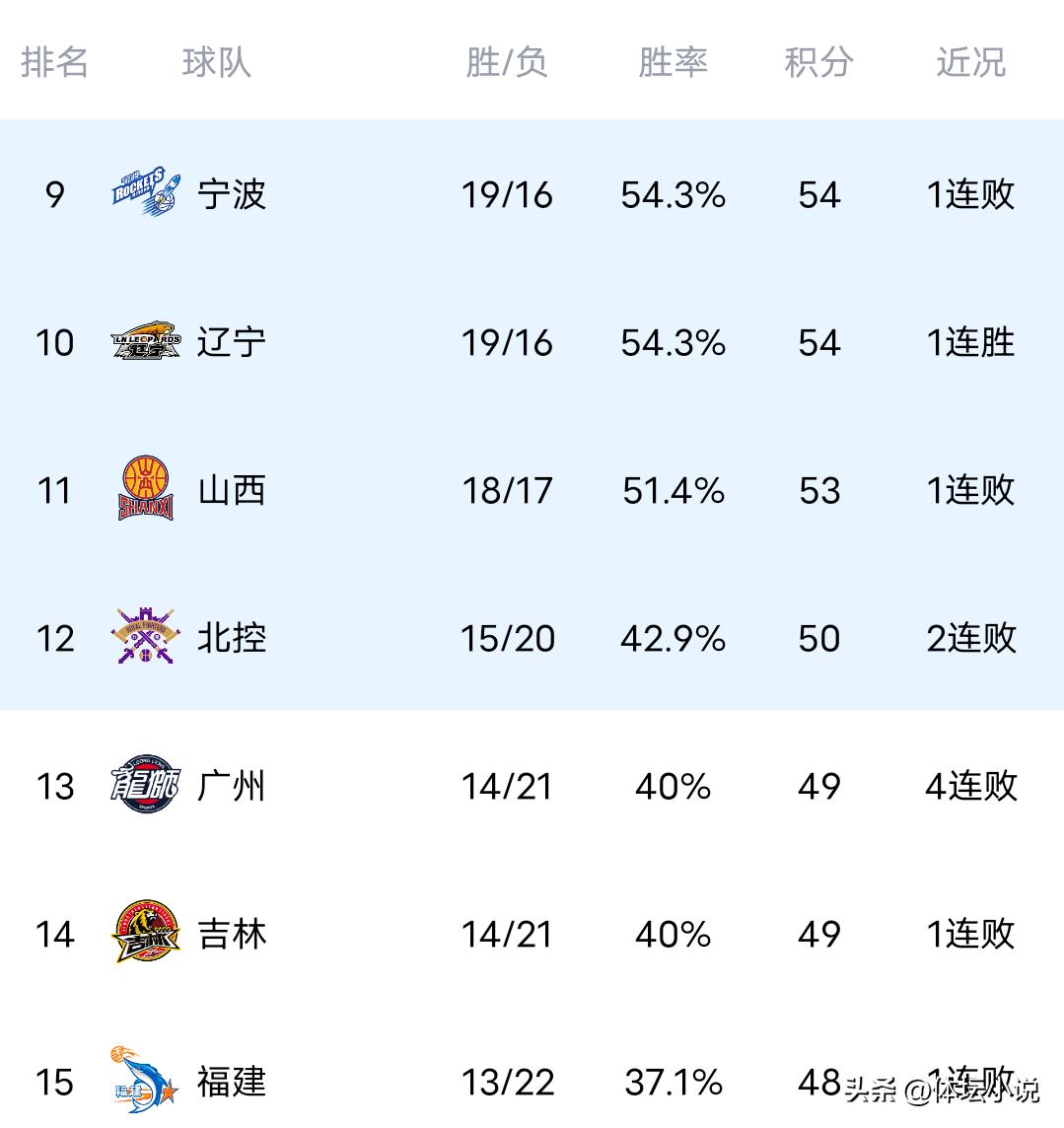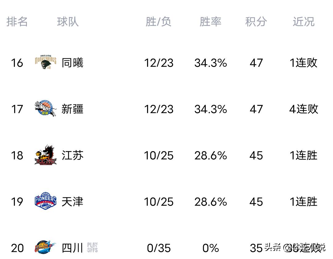 On April 7 Beijing time, the CBA regular season continued. Last night's results included Guangzhou's 81-88 loss to defending champion Guangsha, Jiangsu's 89-88 victory over Beijing Control in a tug-of-war, Shanxi's 97-100 narrow defeat to Qingdao in a clash of last season's dark horses, Shandong's multi-point outburst crushing Guangdong 99-86, super weak team Tianjin's 102-89 win over fast-rising Ningbo, Beijing's 106-92 easy handling of soft opponent Tianjin, and Xinjiang's 97-102 loss to surging Shenzhen. Thus the latest rankings emerged: Shanghai first, Guangsha second, Shenzhen third with a 10-win streak, Shandong surged to fourth, Beijing fifth, Guangdong slipped to sixth, Zhejiang seventh, Qingdao eighth. The top eight have locked playoff berths, while Sichuan sits bottom with 35 consecutive losses!
