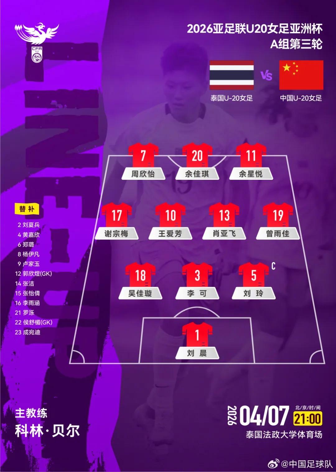 Compared to the previous two rounds, the Chinese U20 women's football team made some rotations in the starting lineup. Forwards Zhou Xinyi and Yu Jiaqi were given starting opportunities, while previously starting forwards Zheng Lu and Lu Jiayu did not start. Key central defender Huang Jiaxin also sat on the bench, and defender Liu Ling entered the starting list.