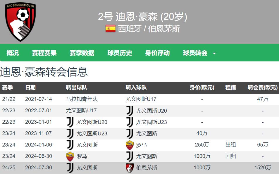 懷森出自尤文圖斯青訓,球員於2024年夏窗以1520萬歐元的轉會費從尤文圖斯加盟伯恩茅斯,當時球員身價僅有1000萬歐元,如今不到一個賽季就已經暴漲至4200萬歐元,並成為伯恩茅斯隊內身價最高的球員,肯定還會上升。