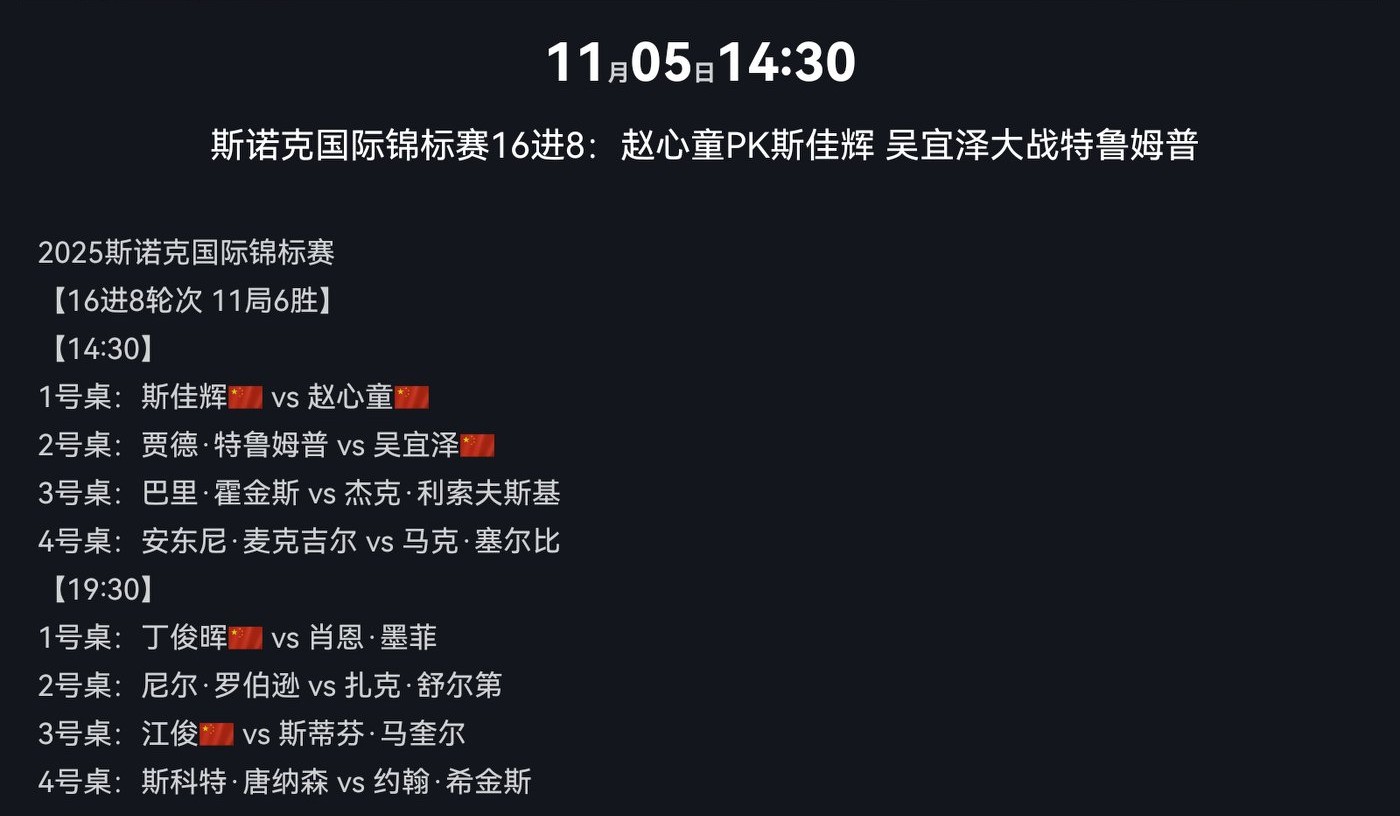 斯諾克國錦賽今日(2025年11月5日)賽程,趙心童、丁俊暉、斯佳輝、吳宜澤與江俊等選手出戰,咪咕視頻直播中。