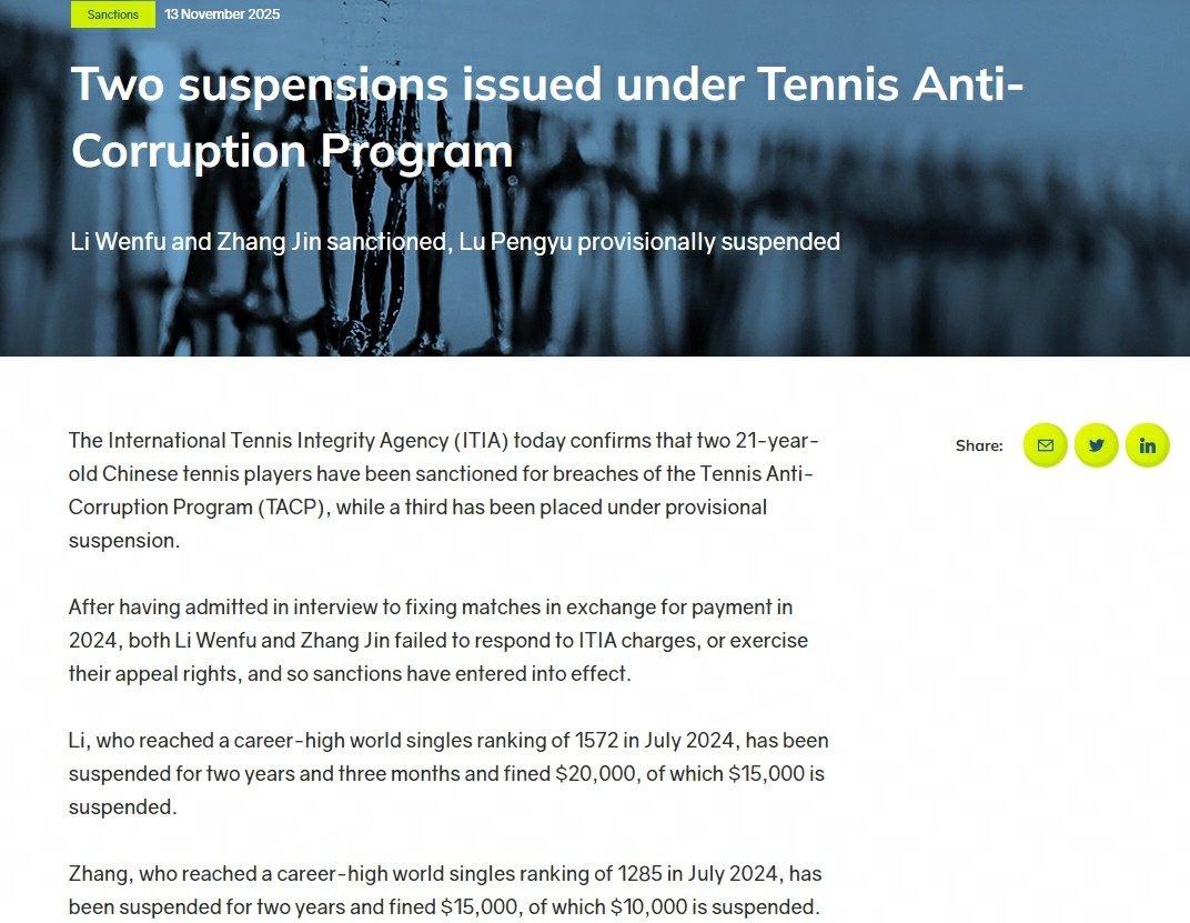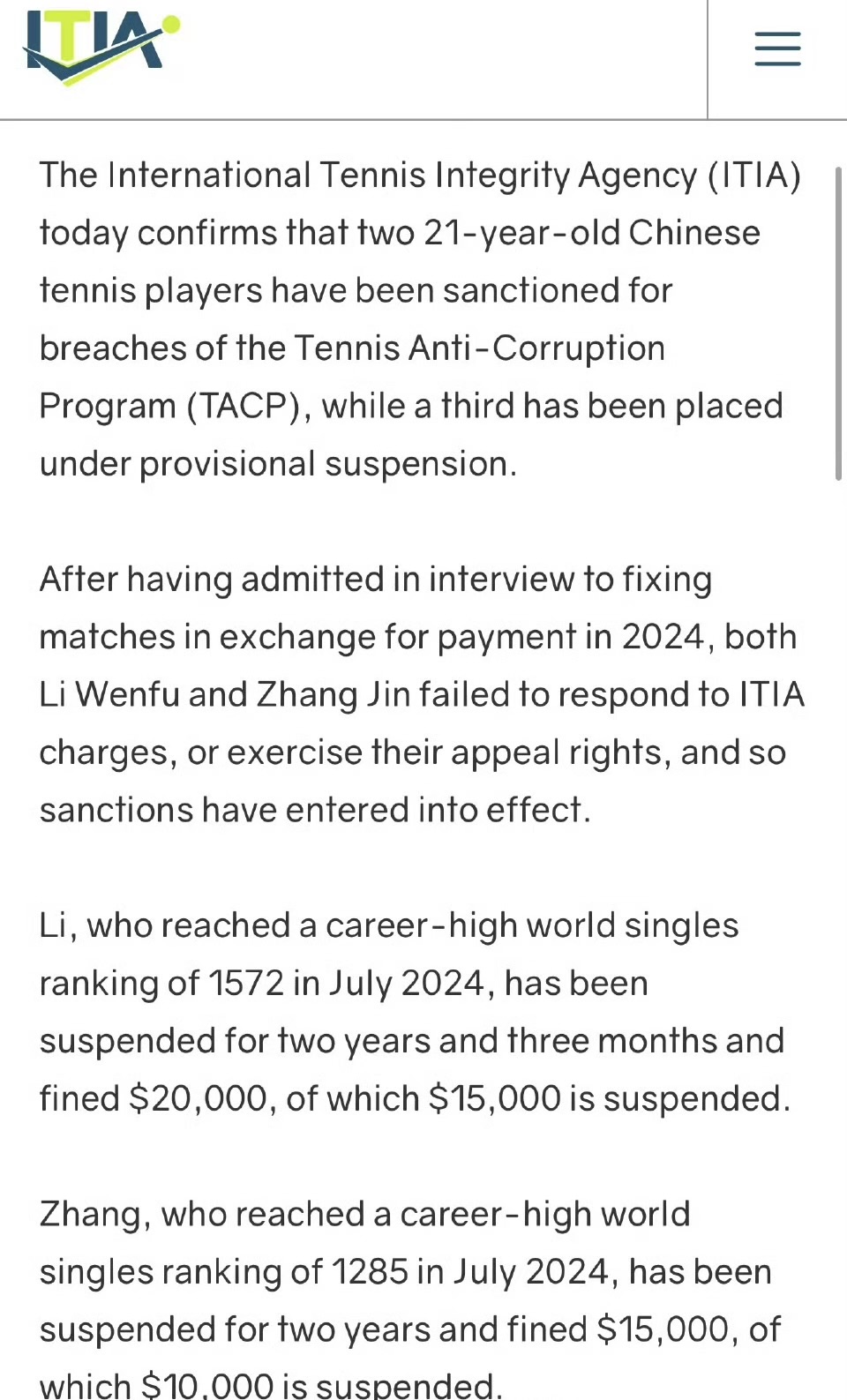 這並非孤例,近期還有多位低排名選手因類似違規行為遭到懲罰。上個月,三名中國選手因打假球被禁賽,其中李文夫被處以兩年零三個月禁賽及2萬美元罰款,其中1.5萬美元罰款暫緩執行;張瑾被處以兩年禁賽及1.5萬美元罰款;陸鵬宇因涉嫌違反《網球反賄賂計劃》相關條款,已被實施臨時禁賽,具體處罰待全面調查後確定。