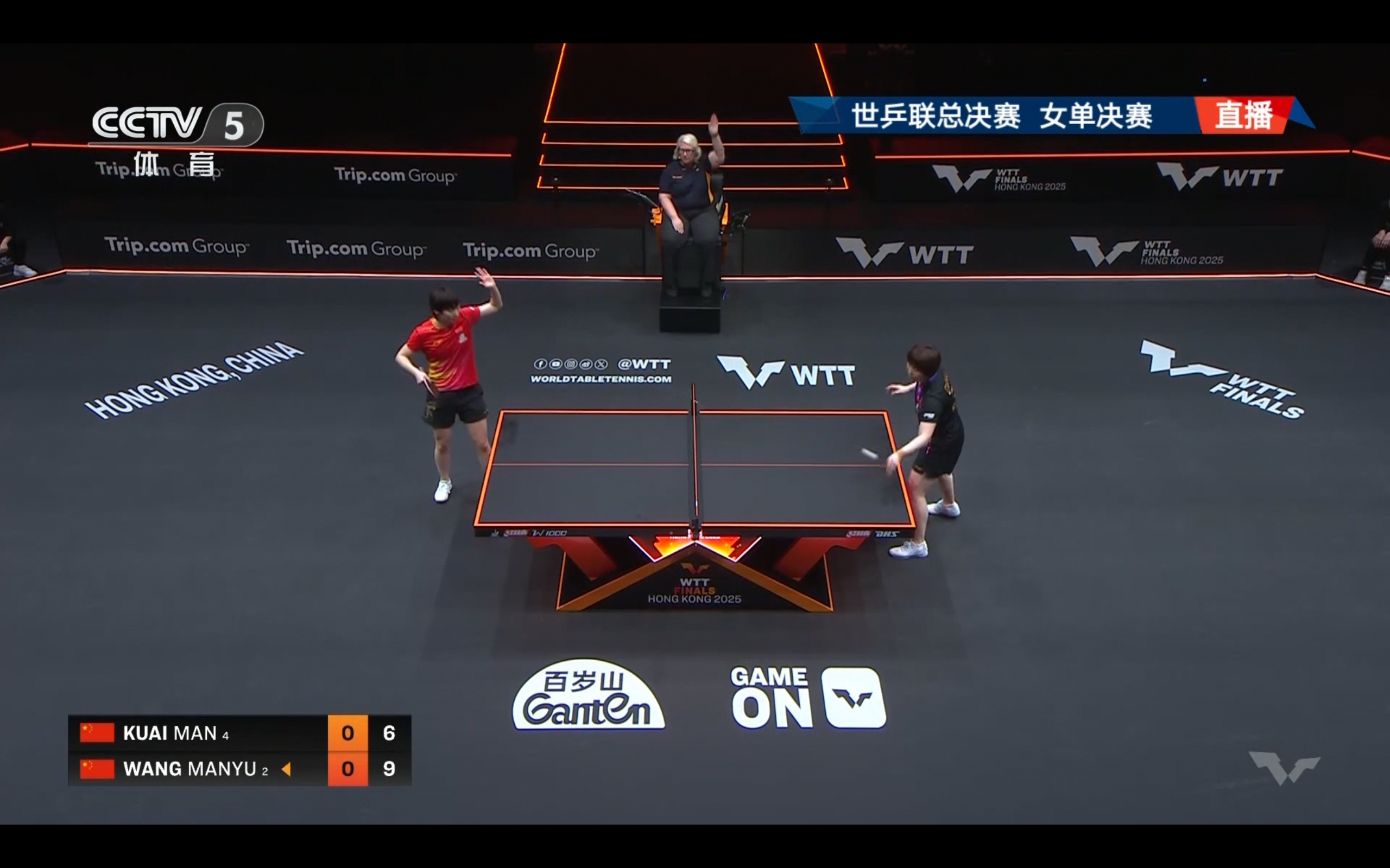 CCTV-5與央視頻正在直播WTT總決賽女子單打決賽王曼昱對蒯曼的比賽。