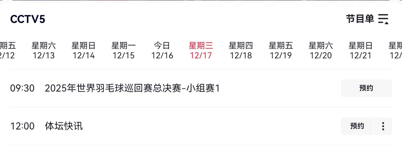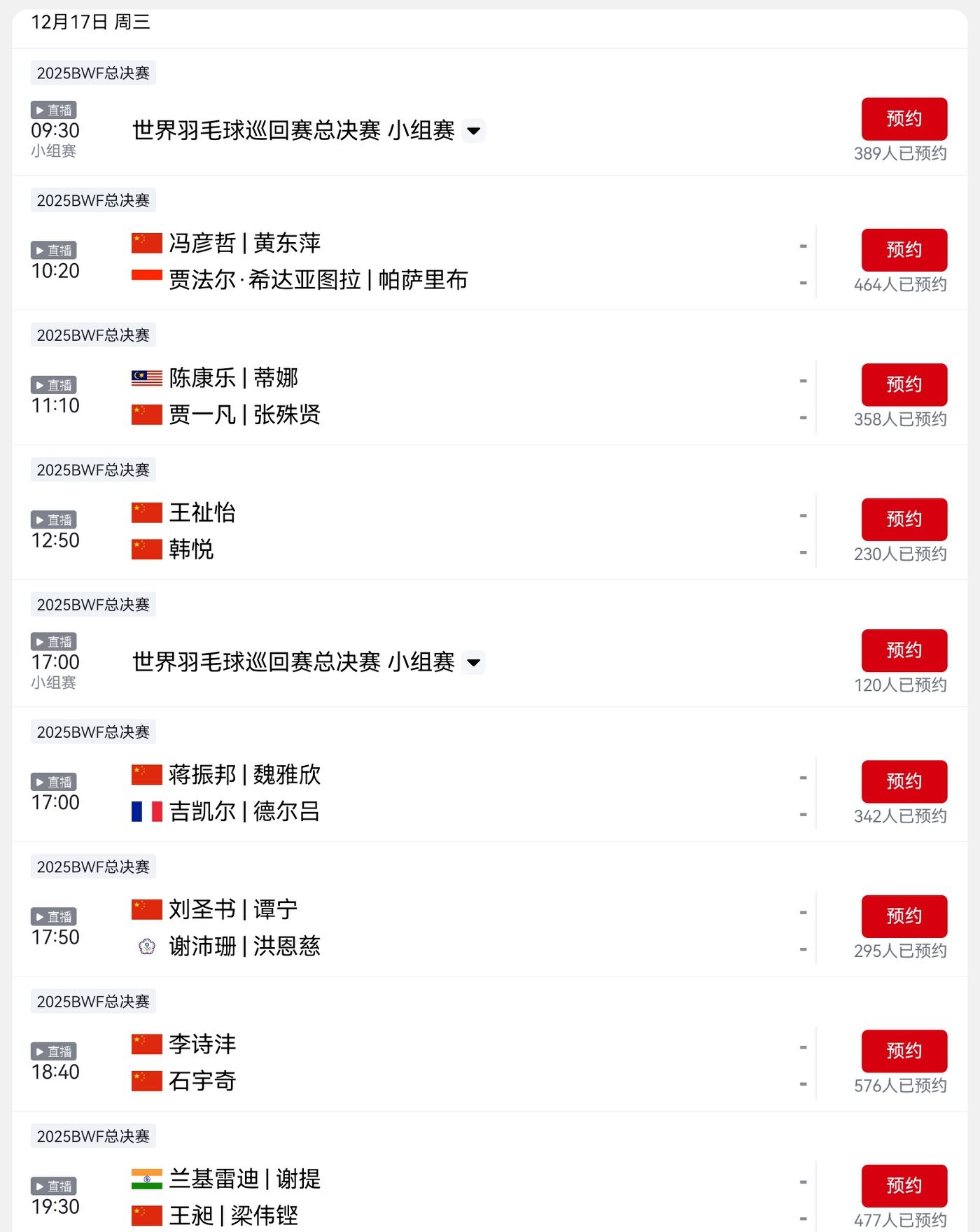 世界羽毛球巡迴賽總決賽將於明天(2025年12月17日)舉行,石宇奇、王祉怡等選手將出戰,央視五套及央視頻將進行直播。