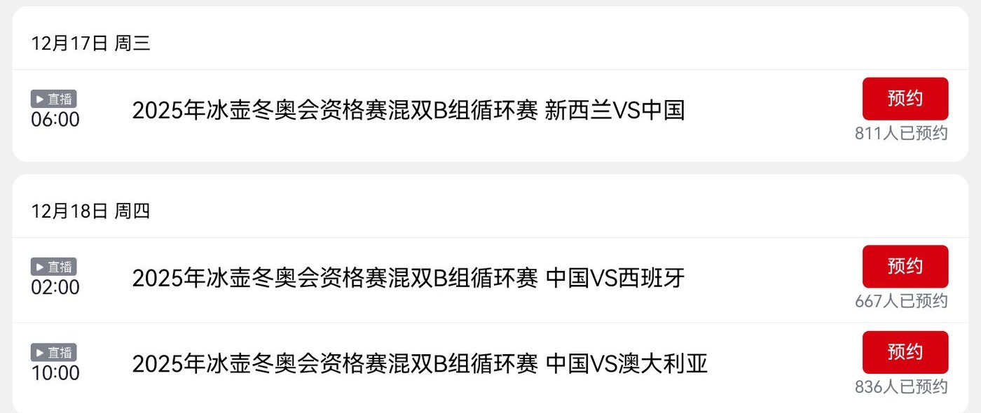 冰壺冬奧會資格賽將於明天(2025年12月17日)舉行,中國隊對陣新西蘭隊,央視頻直播。