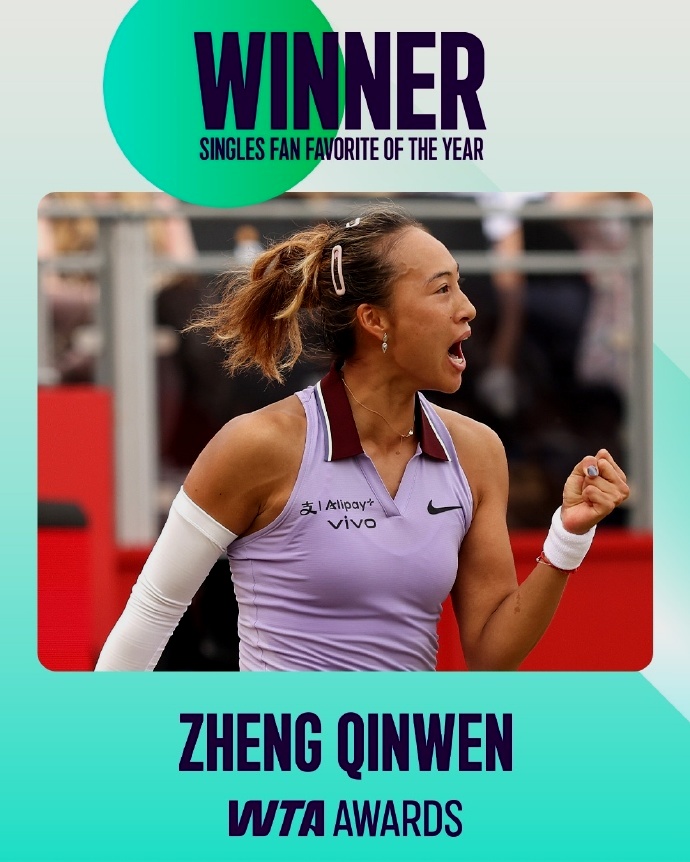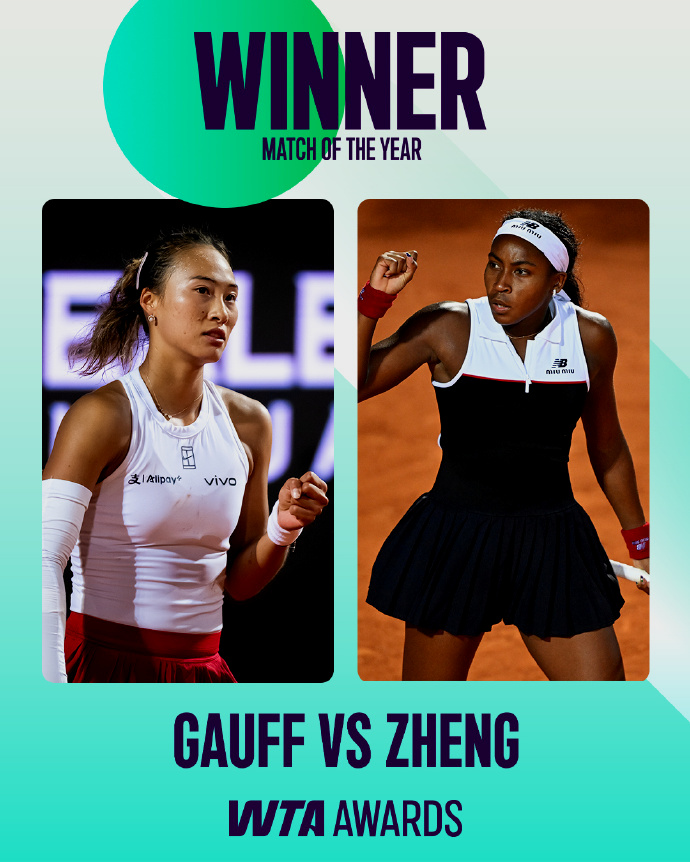 由球迷票選的WTA最受歡迎單打球員獎由中國一姐鄭欽文獲得,這是她連續第二年當選,成功蟬聯人氣女王。此外,鄭欽文與美國一姐高芙在羅馬站半決賽的對決也榮獲2025賽季WTA年度最佳對決獎。稍感遺憾的是,當時小鄭以1-2惜敗於高芙。