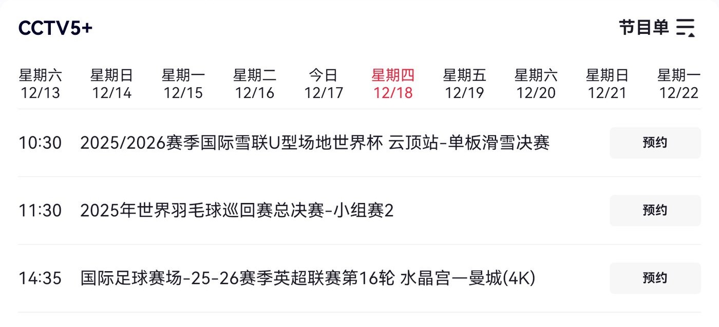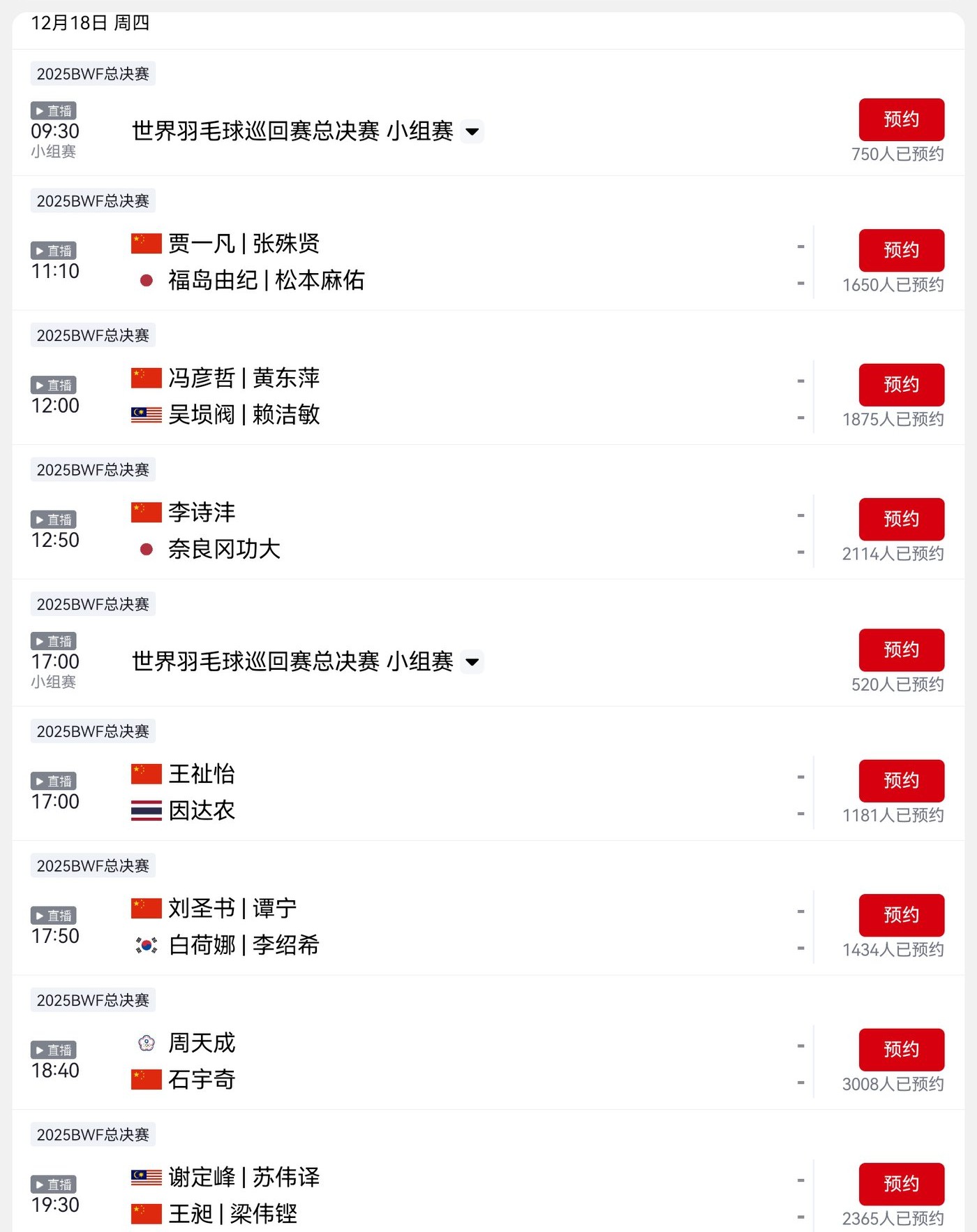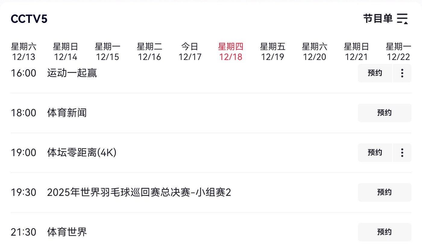 羽毛球總決賽明天(2025年12月18日)賽程,石宇奇等國羽選手將出戰7場,央視五套和央視頻將提供直播。