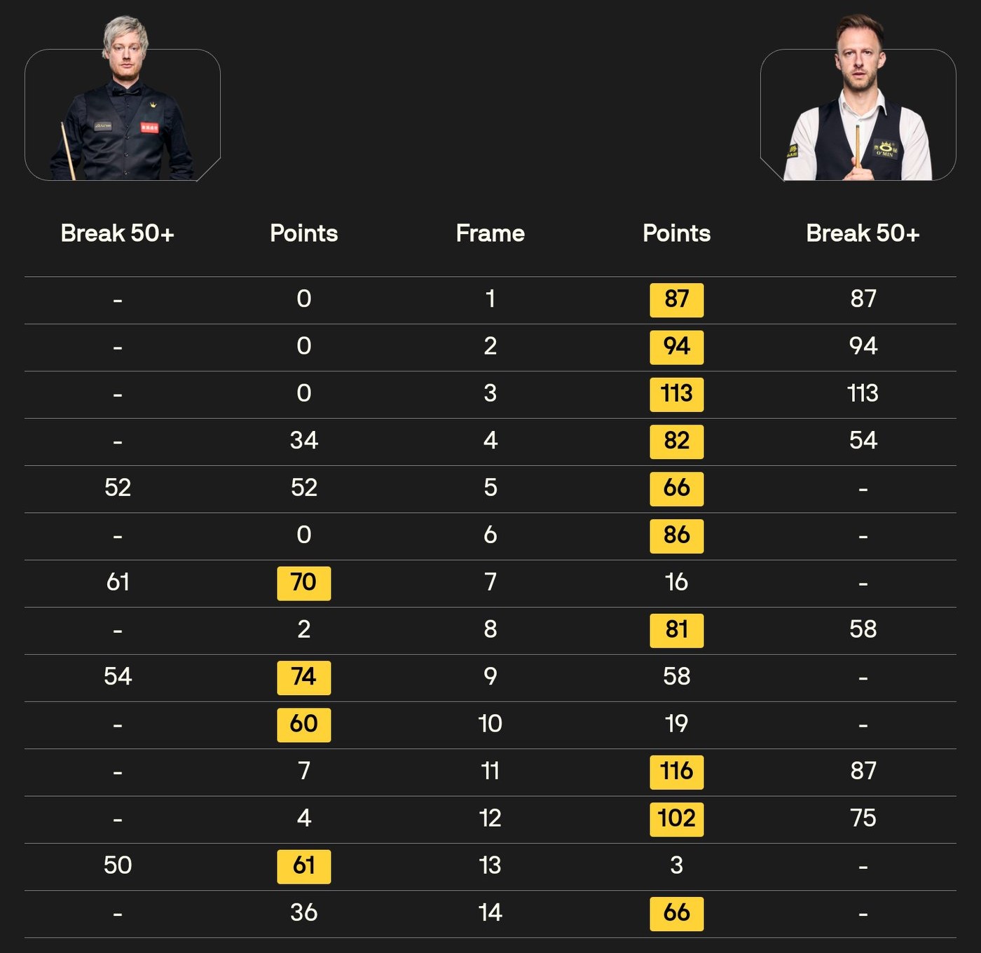 Trump started with a seven-frame streak against Neil Robertson, demonstrating formidable strength and leaving Neil Robertson bewildered and unable to counter. Statistical details are shown in the figure below: Trump achieved one century break and six 50+ breaks, while Neil Robertson only managed four 50+ breaks. Clearly, Trump's offensive capability surpassed that of his opponent Neil Robertson, making his victory well within expectation.