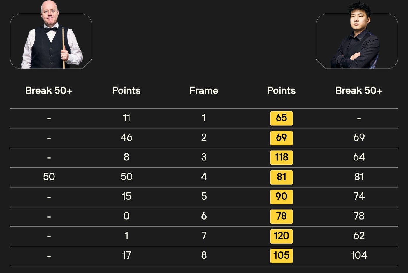 The detailed match statistics are shown in the image below. Zhao Xintong scored six 50+ breaks and one 100+ break. His attacking prowess is exceptionally strong and formidable.