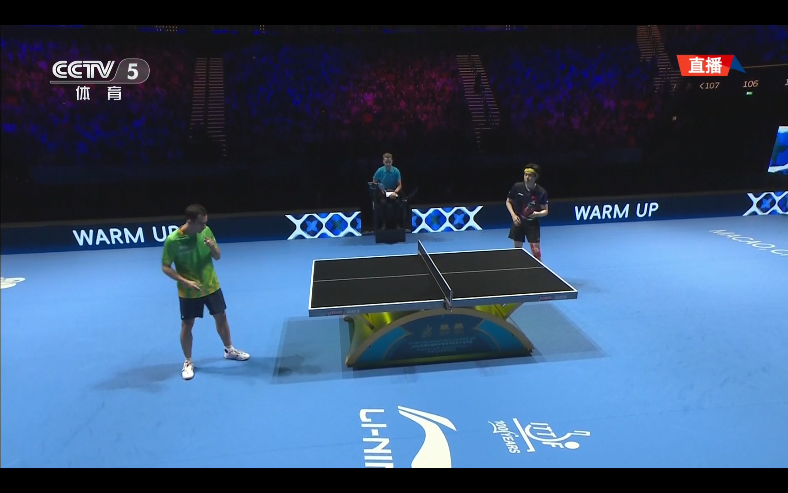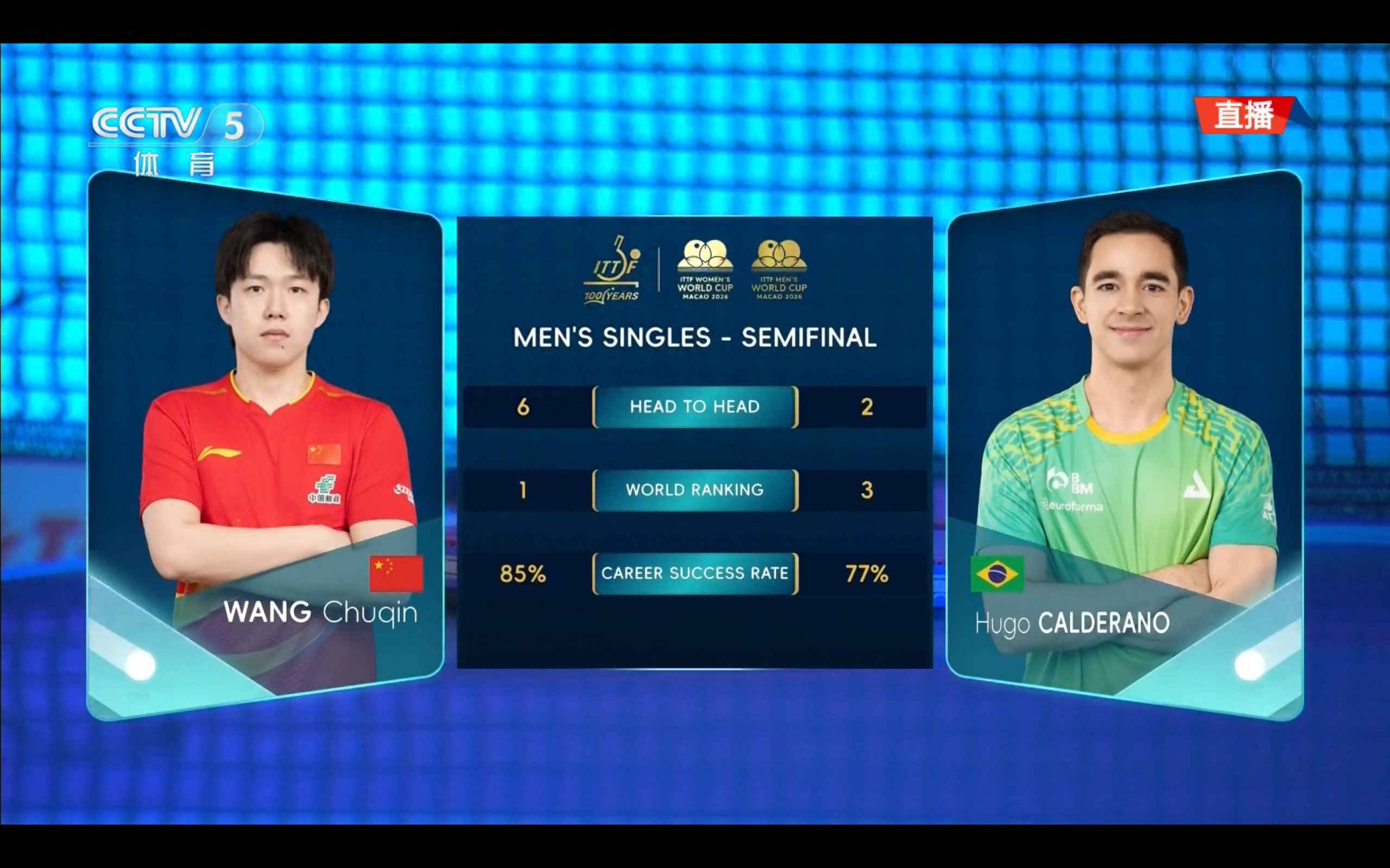 CCTV-5 is live broadcasting the Men's Singles Semifinal of the Table Tennis World Cup: Wang Chuqin vs. Hugo Calderano.