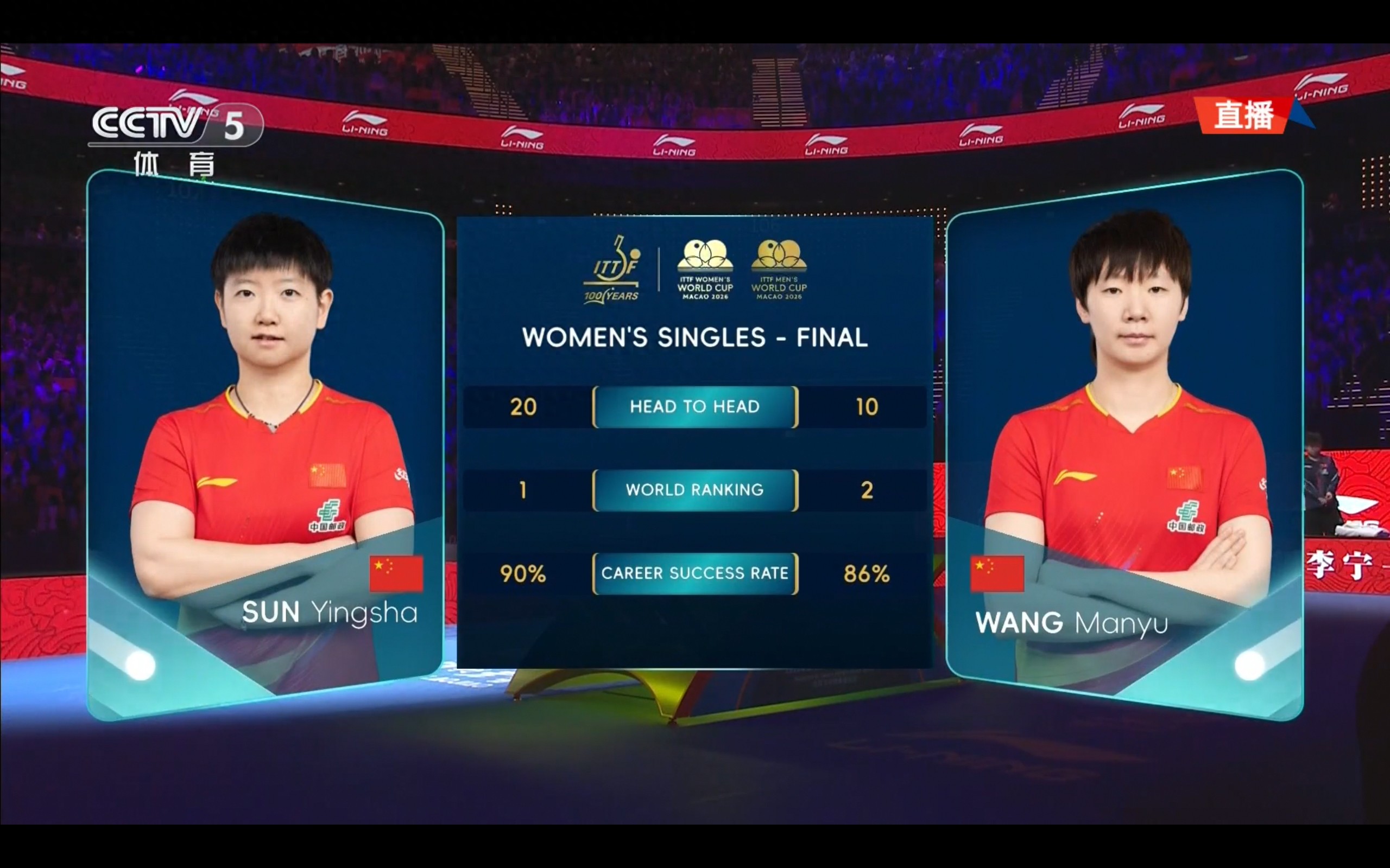 CCTV-5 is live broadcasting the Women's Singles Final of the Table Tennis World Cup between Sun Yingsha and Wang Manyu.